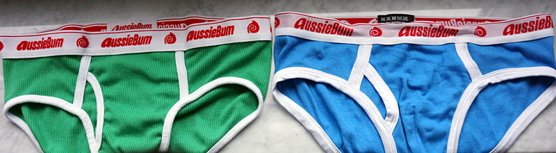 I’m really disappointed with Aussiebum at the moment. I buy lots of undies from the Sydney based company each year. And my favourite undies to put on the guys are the ones above. But recently Aussiebum stopped making the model on the left (green) and replaced them with the model on the right (blue).  I bought a bunch of the new model just before we headed overseas last weekend. The green pair has been worn many times. The blue pair has been worn once (yesterday). And look what happened to the band on them! It looks like an old pair of undies that has been worn many times. I’m amazed that they have changed the quality of the material to a far inferior elastic. Even the coloured material no longer has that nice ribbing pattern across it. All in all, I don’t much like the new model. It looks cheap and seems to wear out very quickly. I wish I had bought up the old model when I could. The new ones suck!